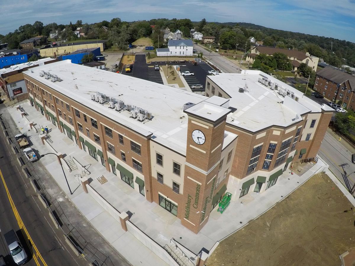 The Middlebury Commons project in East Akron is inching closer and closer to completion! Since our August update, the clock tower has been completed with signage and a clock facing E Market Street.