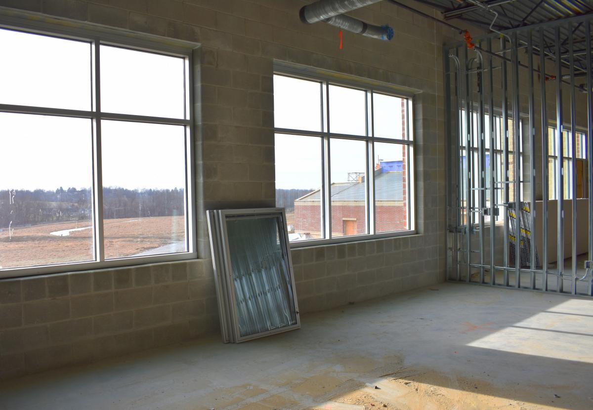 The 2nd floor west stairwell. To the left will be the future softball, baseball and football fields.